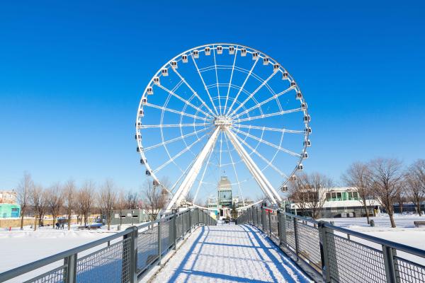 En hiver, l’île Bonsecours dévoile toute la poésie des paysages urbains montréalais. De jour, on y flâne tranquillement ; en soirée, la Grande Roue de Montréal illuminée et le bassin enneigé créent une ambiance douce et féérique, parfaite pour une promenade - à conclure avec une boisson chaude au café situé à ses pieds.